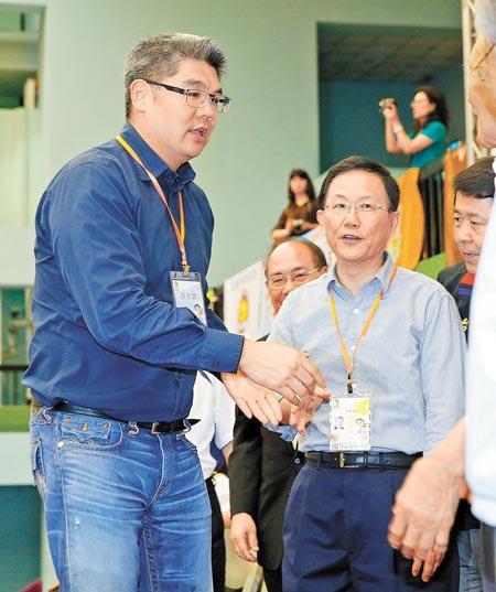 連勝文上臺(tái)時(shí)先與丁守中握手寒暄,簡(jiǎn)短的交談后比鄰而坐。(圖片來(lái)自臺(tái)灣《中國(guó)時(shí)報(bào)》)