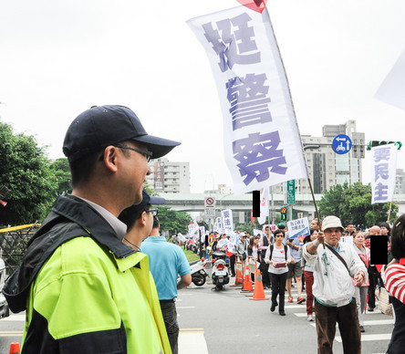 看到游行民眾經(jīng)過,一名值勤警員開心地笑了。(圖片來自臺媒)