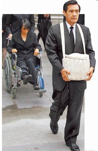馬英九捧著母親骨灰壇準(zhǔn)備安置到靈骨塔,腿傷的周美青坐輪椅緊隨其后。(圖片來自臺(tái)媒)