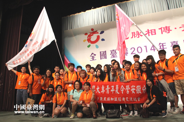 4日上午,全國(guó)臺(tái)聯(lián)2014年臺(tái)胞青年千人夏令營(yíng)開營(yíng)儀式在北京國(guó)際會(huì)議中心舉行。圖為臺(tái)灣青年在開營(yíng)儀式后合影留念。(中國(guó)臺(tái)灣網(wǎng) 李徽 攝)