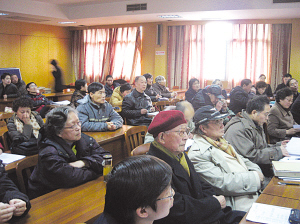 記者昨天下午在南京下關(guān)法院二樓會(huì)議室看到,會(huì)議室里濟(jì)濟(jì)一堂,全是上了年紀(jì)的老頭老太,正全神貫注地盯著眼前一塊投影幕布,幕布前,一名女法官正手執(zhí)木棒,指著幕布上的文字和圖表,大聲朗讀。