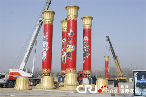 圖為奧林匹克公園里,工人們正在安裝民族團結(jié)柱 (圖片來源:國際在線)