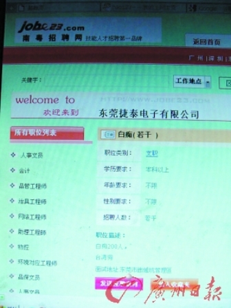 昨日下午,記者多次撥打東莞捷泰電子有限公司電話,都無人接聽。在快下班時,記者終于和該公司兩名值班人員聯系上,但他們表示,并不知網上招聘一事,并讓記者第二天再和公司聯系。
