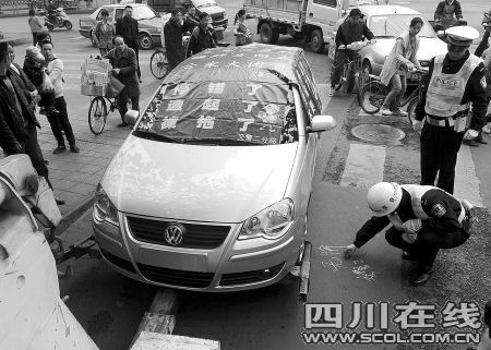 “停錯了!遭起了!被拖了!”14日上午,在成都太升南路兒童醫院旁,一輛亂停亂放的標致307被交警罩上了一件特殊的“外衣”,“外衣”上醒目的幾行字,引起了不少市民駐足圍觀。面對如此“雷人”的外衣,市民褒貶不一。