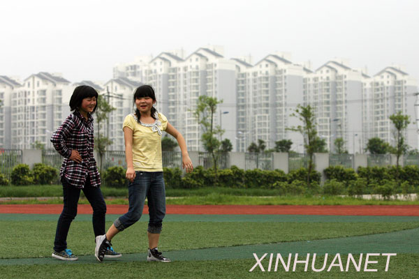 5月7日,兩名女中學生在學校操場上漫步,她們身后是新建成的安居住房。“5·12”特大地震使四川省都江堰市城鎮住房嚴重受損,共有10.89萬個家庭、30余萬人的住房不同程度地遭到破壞。曾經物華天寶、山清水秀的小城,在短短的80秒地震后,變成了滿目瘡痍、傷痕累累的極重災區。新華社記者鄭悅攝