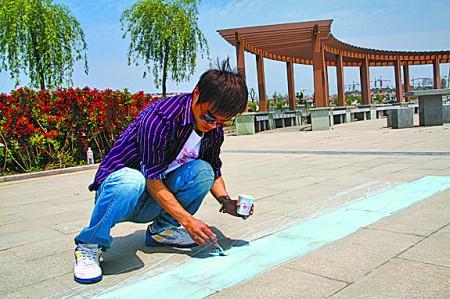 藍(lán)色粉筆,幾盒顏料,在畫師馬赫的畫筆下,能讓畫的水池“跳”出來。14日中午,畫師馬赫在臨沂涑河南街和狼牙王路交叉口的沿河廣場現(xiàn)場展現(xiàn)他的3D繪畫技能。