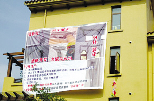 從外觀上看,常州一個名為“西城·格蘭藝堡”的小區(qū)是一個典型的歐式花園洋房,然而,近來,該小區(qū)一洋房的山墻上懸掛的巨幅海報著實吸引了不少當?shù)剡^往市民的目光,該洋房的業(yè)主張先生在房屋出現(xiàn)諸多質(zhì)量問題后與開發(fā)商交涉未果的情況下,只得出此下策,在自家房屋的山墻上懸掛了巨幅海報,海報上除了印有房屋內(nèi)部細節(jié)的巨幅照片之外,還列舉了整整五條該房屋的種種“毛病”,業(yè)主自稱此房為常州最牛“豆腐渣”洋房,歡迎市民前來參觀每面墻的裂縫以及漏水“精品”。