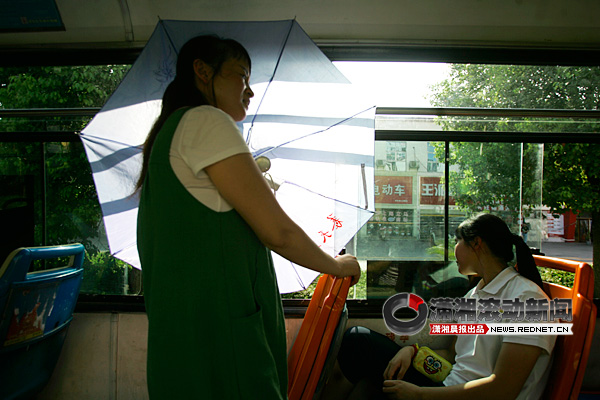 2公交車上,市民撐傘阻擋強(qiáng)烈的太陽。 圖/瀟湘晨報滾動新聞記者 華劍