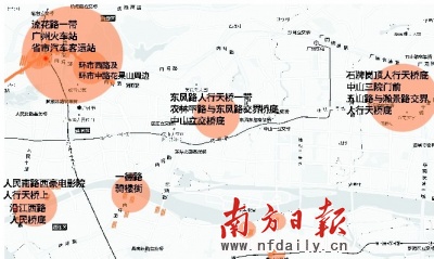 南方日報記者連續3個月走訪,繪出廣州中心城區“乞討地圖”,圖中橘黃色為乞丐集中區。