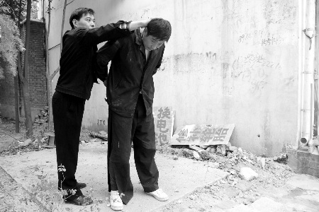李付俊(右)找人還原當晚他頭被摁住的情形。他的右褲腿右側從下到上被撕開,他說是執法人員干的。見習記者 趙卓/攝