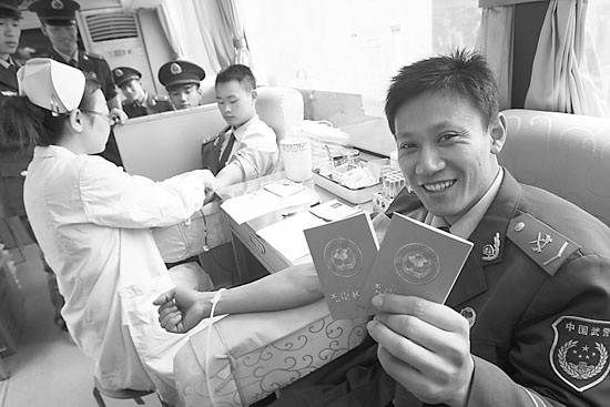 重慶籍老戰士張健在展示獻血證,當兵5年他已獻了6次血。李博攝(資料圖片)