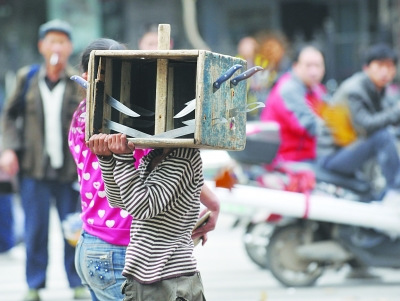 記者接到市民報料趕到朝天宮附近看到,一名十四五歲的女孩將一個四方形箱子套在一個10歲左右的男孩頭上,然后將七八把鋒利的水果刀左右斜向插進箱子里。打開箱子后,男孩的頭部不見了。身體卻還坐在一張板凳上來回扭曲,似乎是在費力地掙扎。姐弟倆近乎“自殘”的賣藝表演,把不少路人嚇得不輕,一名騎摩托車飛馳而過的路人嚇得一個急剎車差點翻車。記者看到,兩人穿著比較破舊,一副楚楚可憐模樣,F場除了幾樣簡單道具和一組放歌曲的音響外,還有一個垃圾筐放在前面收錢。記者環顧四周,并未看到有監管小孩的成年人。穿著紅花衣裳的姐姐大聲說著一些功夫了得之類的話,而頭部裝進木箱子看不見的那個10歲孩子沒有開口說一句話,只是不停地扭動著身軀表演。
