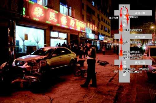 在黃河三路以南的大觀園商場附近,劉某又將騎自行車的女子姜某撞傷。在繼續向南逃竄的過程中,劉某將騎乘電動車的賈某、商某母女倆撞飛,轎車拖著電動車向南行至黃河二路以南時,又撞上兩輛轎車及一輛摩托車,最后停在一家飯店門口,其間還將路邊的行人程某撞傷。