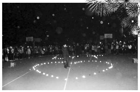 據(jù)該校大二女生蓓蓓(化名)回憶,當(dāng)晚9點(diǎn)30分許,她正和舍友去操場健身,忽然聽到一群男生在大聲喊,好奇地過去一看,發(fā)現(xiàn)在一號(hào)女生宿舍前,有一二十名男生燃放煙火,向女生宿舍喊話。男生們還用酒精燈在小半個(gè)籃球場大的空地上,擺出“心”形。求愛“男主角”站在其中打電話。