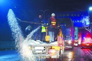 16日凌晨,九江長江大橋養(yǎng)護人員在除雪融冰保暢通。當日凌晨,受強降雪影響,江西九江長江大橋橋面被厚厚的冰層覆蓋,排隊等候過橋的車輛長達數(shù)十公里。洪顯智攝(資料圖)