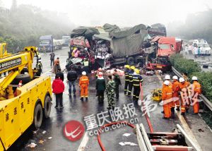 昨日(22日)凌晨,濃霧鎖城,渝遂高速公路能見度不足20米。上午8時許,渝遂高速遂寧往重慶方向青木關路段發生多起車禍,2公里長的公路上,幾十輛大貨車、客車及轎車相繼撞在一起,事故共造成5人當場死亡、10人受傷。