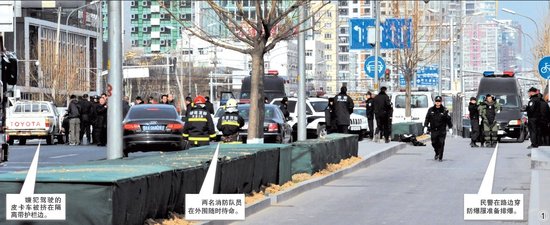民警試圖進(jìn)一步接近皮卡車時(shí),司機(jī)隔著車窗大喊車?yán)镉姓ㄋ帯榘踩鹨,民警立即上?bào)市公安局,并迅速對(duì)西大望路采取交通管制。此后,西大望路北起平樂園路口,南至北工大路口以南天橋,一公里左右的主路被全部封閉,輔路行人和附近居民被緊急疏散,附近地鐵站封閉臨時(shí)甩站通行。