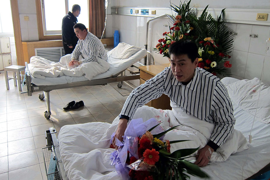1月5日,在堵截持槍歹徒戰斗中負傷的泰安市交警支隊直屬一大隊副隊長劉峰(右)和中隊長趙偉在醫院治療。新華社記者朱崢攝