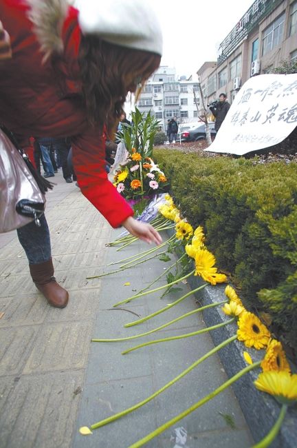 山東農(nóng)業(yè)大學(xué)、泰山醫(yī)學(xué)院的學(xué)生代表,也紛紛準(zhǔn)備了鮮花、自制的紙花,以及他們親自書(shū)寫(xiě)的寫(xiě)有“人民英雄,一路走好”、“愿逝去的英魂安息”等字樣的挽聯(lián)。