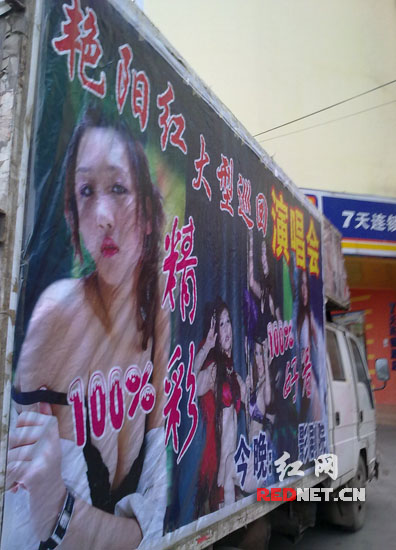 宣傳車就停靠在長沙汽車南站電影院門口附近。宣傳畫面變化了,變成幾個年輕女子袒胸露乳“色誘”乘客。表演節目名稱變成了“艷陽紅大型巡回演唱會”。