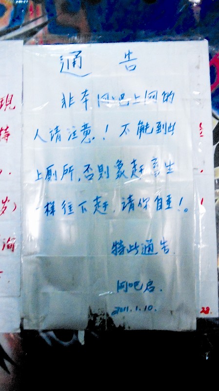 網帖所指的是漢口一家“叮當網吧”,位于新馬路堤角小區,緊挨輕軌新榮站和新榮客運站。昨日,記者來到這家網吧,見到這張雷人的通告,而在網吧的衛生間門口,還貼有另一張通告,同樣是拒人如廁,用詞甚為不雅。網吧老板王女士一臉無奈說,“都擠在我這里上廁所,我哪還有生意做……”