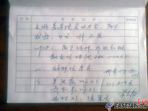 圖片說明:東方網(wǎng)記者在病歷卡上看到,醫(yī)生診斷為接觸性皮炎。