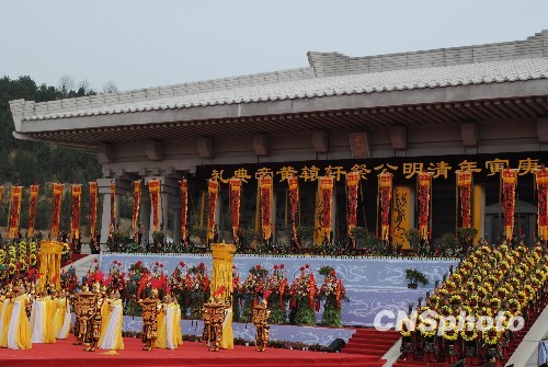 資料圖:2010年(農歷庚寅年)清明節,萬余名海內外華人代表齊聚陜西黃帝陵祭祀大殿前,共同拜祭中華民族的人文始祖軒轅黃帝。圖為4月5日,樂舞告祭的場景。 中新社發 冽瑋 攝