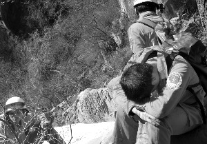 前日,救援人員把被困人員帶到直升機(jī)下等待救援。記者 王貴彬 攝