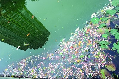 “快來看啊,復成橋和大中橋附近內秦淮河河面上出現不少死魚。”昨天下午,記者接到居民姚先生報料后趕緊來到常府街復成橋一帶,沿著河邊一直走了數百米走到大中橋,果然發現河面有不少漂浮的死魚。居民反映,是不是內秦淮河水質遭到附近生活污染源污染了?同樣接到市民舉報趕來取樣檢測的南京白下區環保局徐天驕副局長稱,從目前走訪的初步調查看,死魚的主要因素應該與天氣悶熱缺氧有關,至于具體河水水質指標的數據監測還需要等水樣檢測結果才能知曉。