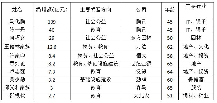 本次榜單是將2015年4月1日至2016年3月31日期間的現(xiàn)金捐贈、和現(xiàn)金相關(guān)的捐贈、有法律效力的承諾捐贈以及2016年4月-5月的過億捐贈都統(tǒng)計在內(nèi)。若以企業(yè)名義捐贈,企業(yè)捐贈額乘以企業(yè)家所持股份比例后計入企業(yè)家個人捐贈。