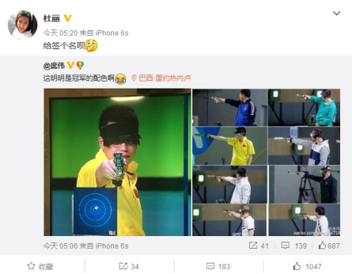 8月9日,龐偉曬出自己的奧運參賽照片,并配文:“這明明是冠軍的配色啊”。而杜麗則回復(fù)道:“給個簽名唄”。