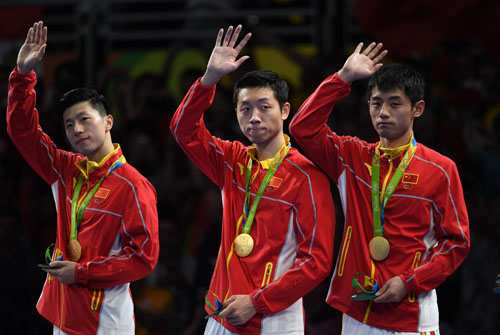 在2016年里約奧運(yùn)會乒乓球男子團(tuán)體賽決賽中,中國隊(duì)以3比1戰(zhàn)勝日本隊(duì)獲得金牌。 新華社記者 殷博古 攝