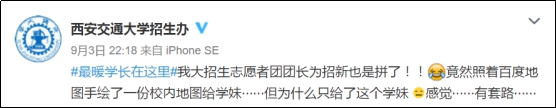9月3日,西安交大開學(xué)迎新時(shí),招生志愿團(tuán)的團(tuán)長(zhǎng)送了學(xué)妹一張校園手繪地圖,瞬間就被學(xué)妹捧為“最暖學(xué)長(zhǎng)”。這事兒還被西安交大招生辦曬到了微博上。這幾天連北大、廈大、華科大等高校也紛紛轉(zhuǎn)發(fā)湊熱鬧,曬出各種創(chuàng)意地圖PK,這“仙交大”的手繪地圖就過了一把“網(wǎng)紅”癮。