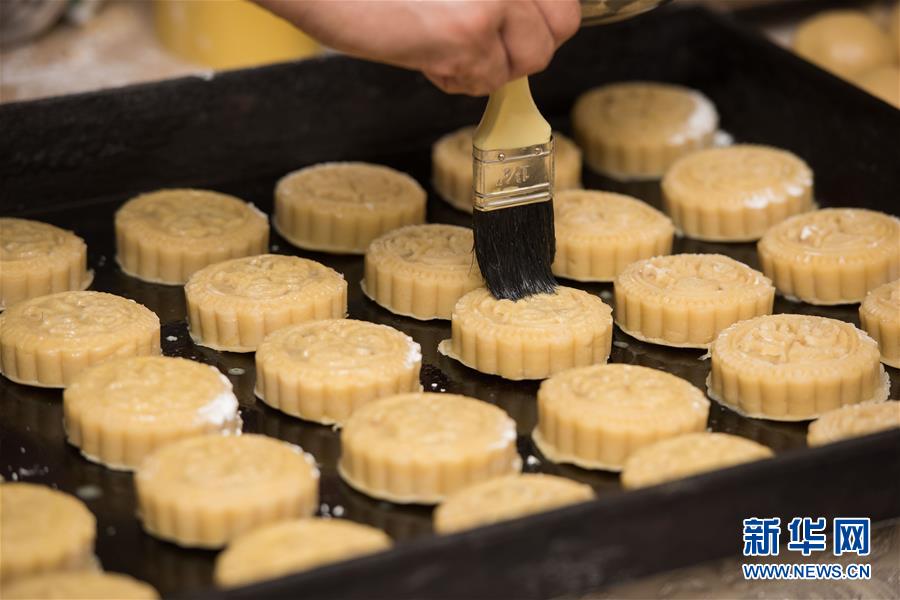 9月14日,在埃及首都開羅,“如意坊”的一位糕點(diǎn)師傅在給月餅坯子刷蛋液。