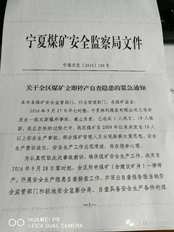 9月27日,寧夏煤礦安全監(jiān)察局為認真吸取此次事故的教訓(xùn),確保煤礦安全生產(chǎn)工作,印發(fā)緊急通知。通知指出自2016年9月28日零時起,全區(qū)所有煤礦(含建設(shè)礦井)一律停產(chǎn),開展安全生產(chǎn)隱患自查排查工作,并寫出自查報告報當(dāng)?shù)匕踩O(jiān)管部門和駐地安全監(jiān)察分局。自查具備安全生產(chǎn)條件的煤礦,經(jīng)復(fù)工驗收合格后方可開工生產(chǎn)(或建設(shè)),不具備安生生產(chǎn)條件的煤礦,或經(jīng)復(fù)工驗收不合格的煤礦,一律不得開工生產(chǎn)(或建設(shè))。