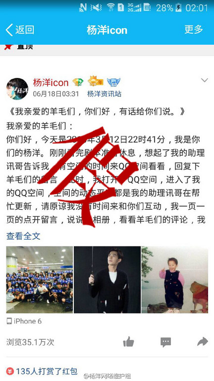 楊洋被人假冒身份開假賬號 騙取粉絲大量錢財