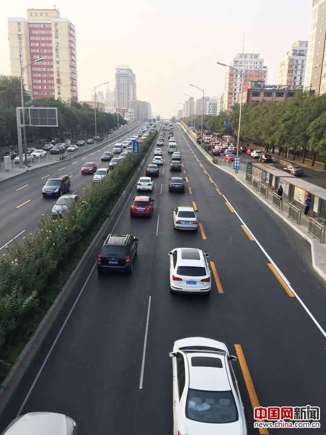 中國網記者今早6點50分開車體驗了三環路公交專用道開啟首日,北三環太平莊橋到西三環花園橋的路況,與平日相比,今日因正式啟用首條環線公交專用道,原本三條路變成兩條路,早高峰道路擁堵明顯提前。未啟用公交車道前,記者走這段路大概10分鐘,今天用了20多分鐘。