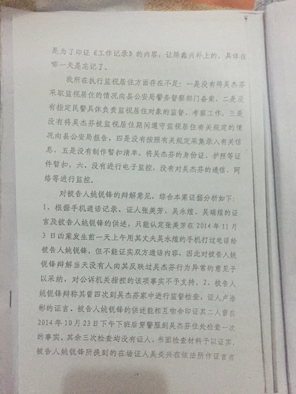 姚銳鋒回應稱,在吳杰芬監視居住期間,他本人曾多次去看過吳杰芬,也曾和長崗派出所副所長盧浩彬一起去看過。