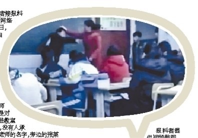 在報(bào)料者向記者提供的一段時(shí)長(zhǎng)9秒的視頻顯示,事發(fā)時(shí)一學(xué)生在教室黑板前被一著紅色棉衣的女教師抓住頭發(fā),被打?qū)W生雖極力反抗,但仍被紅衣女教師連扇數(shù)耳光,同時(shí),教室門外還站著兩個(gè)學(xué)生,教室內(nèi)的學(xué)生一片寂靜。