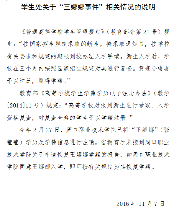 《河南省教育廳學生處關于“王娜娜”事件的情況說明》