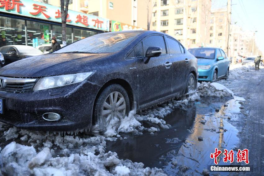長春管道爆裂結冰 路邊車變成“大冰雕”