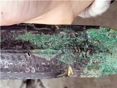 二是劍身呈黑色的地方為黑漆古,黑漆古是由于古銅長期存放在潮濕的地方,其表面生成的一層極穩(wěn)定的保護薄膜,重慶地區(qū)潮濕,劍身有黑漆古出現(xiàn)是合乎常理的。