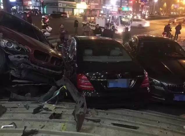 昨天晚上11點多,不少人的朋友圈被一起多輛豪車相撞的消息刷屏了。從圖片上看,發生碰撞的車傷得不輕,兩個大奔兩個寶馬,其中暗紅色寶馬越野車的前保險杠整個掉了下來!
