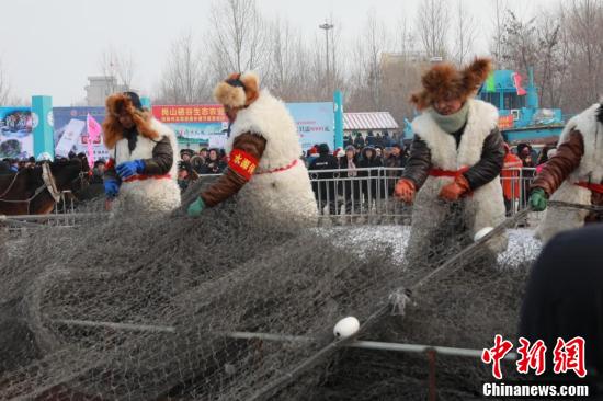 1月22日,遼寧省撫順市,拉網的漁民。當日,2017神州北湖(中國撫順)首屆冬捕節啟幕,民俗表演、拉網出魚、頭魚拍賣、游客逛年貨大集等活動逐一展開。中國北方的冬捕,沿襲悠久的漁獵文化,再現古老的漁獵盛況。此次冬捕,采用2000米的大拉網深入冰底網魚,每日下網2次,最多時一網可出魚4萬斤左右。開幕當日,頭魚中32斤的胖頭魚、38斤的青魚和18斤的草魚,分別拍出90.8萬元、46.8萬元、46.8萬元。中新社記者 沈殿成 攝