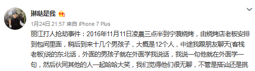麗江打人搶劫事件:2016年11月11日凌晨三點半到寧蒗燒烤,由燒烤店老板安排到包間里面,稍后到來十幾個男孩子,大概是12個人,中途我跟朋友聊天(客棧老板)說的東北話,外面的男孩子就在外面學我說話,我說一句他就在外面學一句,然后伙同其他的人一起哈哈大笑,我們覺得他們很無聊,不管是搭訕還是挑釁的意思,我們沒有理會,繼續(xù)吃烤聊天,隔一會對方又開始學我們說話,這一次學完我們說話還辱罵我們,之后我們就問他什么意思,是不是喝多了酒,起初他們還沒有回復,之后我們就各自吃烤肉了,其中有個穿藍色馬甲的中年男人,到我們我們間的門口打量我們包間,我們就不知道什么意思,我們還是繼續(xù)吃烤肉,之后他們就拿起酒瓶子進我們的包間,把酒瓶子砸到我們頭上,我們當時就是暈的,之后我就被那三四個男人拉著頭發(fā)給拖到燒烤店的門口外面,一頓暴打,一邊錄視頻一邊打,之后覺得錄視頻的效果不好,又扯著我的頭發(fā)面朝天的樣子,繼續(xù)錄視頻暴打我,一邊打一邊還說:你不是東北人嚒?你不是很牛逼嗎?然后就哈哈大笑,把我打得滿臉都是血,還在拿碎掉的酒瓶子劃我的臉,之后他們去抽煙休息了,在我流血的過程,他們要求我按照他們說的話去說,不然就把我拖到山上去給埋了,威脅我的內容是:小妹妹,你是不是自己從樓上掉下來摔成這樣的啊?要不要哥哥們幫你打120啊?要不要哥哥們救你啊?我們看你好可憐啊。我學著他們的話去說,這個過程他們是全程錄視頻的,反偵察的能力很強,說完之后就繼續(xù)打我,又了打了一頓,最后這次打完我,臨走之前有個狠狠地踢我一腳。我直接噴血了。這一腳我直接不行啦,上不來氣了,他們走之前丟給我手機,讓我自己打120 ,這是看我不行了,快死掉了,走的時候拿走我們身上帶的錢,錢包和手機,三個被打得人,只留了我這一部手機,還是看我不行了,給我打電話自救的,我們三個人被足足打了半個小時,他們臨走之前還揚言說:他們就是當?shù)厝恕⒉慌戮臁㈦S便告、還說在麗江在看到我、讓我有去無回....120是早上6:30左右來的,這期間我一直在流血,我打120的時候,我不知道燒烤店的名字,我問燒烤店的老板,他說完以后我就昏迷了,我們在這個燒烤店被打這么久,燒烤店的老板沒有報警和打120,就眼睜睜的看著我們被打,后來警方得知這個燒烤店和那其中的一個人是認識的,他們走的時候開著一輛白色的轎車走的。