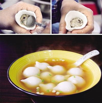 只見老板娘用手揪一小團(tuán)濕面,擠壓成圓片形狀。用勺子挑一團(tuán)餡放在糯米片上,再用雙手邊轉(zhuǎn)邊收口做成湯圓。(圖⑧,吳晨鳴攝)做得好的湯圓表面光滑發(fā)亮,有的還留一個(gè)尖兒,像桃形。“湯圓表皮已含有足夠的水分,很黏,不易保存,最好現(xiàn)做現(xiàn)下了吃。現(xiàn)在有了速凍工藝,湯圓才出現(xiàn)在商店里。”說(shuō)完,她將包好的湯圓一個(gè)個(gè)下鍋。