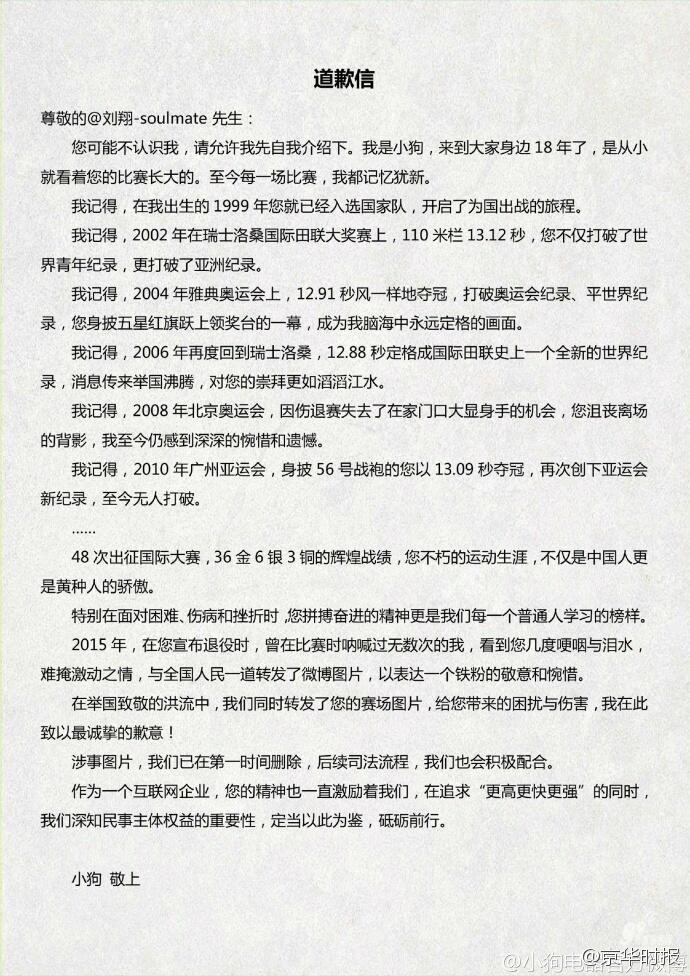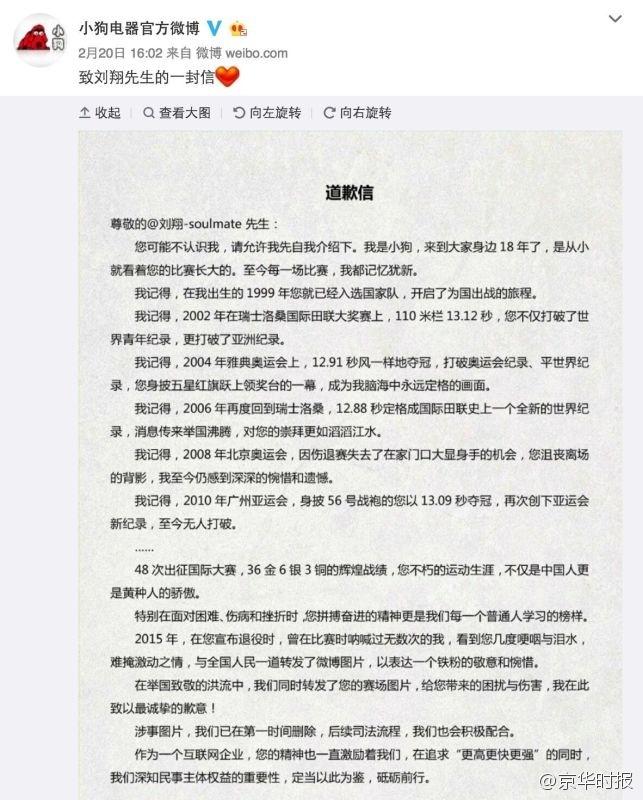 【劉翔維權(quán)事件再起!】#劉翔起訴小狗# 劉翔維權(quán)風(fēng)波再起,日前,小狗電器因曾向前國家運動員,奧運冠軍劉翔退役致敬,未經(jīng)劉翔同意使用其照片發(fā)布于@小狗電器官方微博 上,受到劉翔起訴,要求索賠人民幣近60萬元。新媒體營銷大行其道的當下,肖像權(quán)、版權(quán)等諸多問題逐漸浮現(xiàn)。如何合理合適的運用致敬方式,是企業(yè)新媒體運營應(yīng)當思考的。
