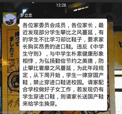 根據網友貼出的微信截圖,一則面向家委會成員的通知顯示,因最近發現部分學生攀比之風蔓延,有的學生不比學習卻比鞋子,要求家長購買昂貴的進口鞋,為此年段規定,從下周開始,學生一律穿國產鞋,禁止穿進口鞋進校園。通知中還稱,若發現仍有學生穿進口鞋,則請家長送國產鞋來給學生換穿。