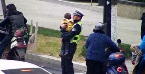 王曉璐一手抱著孩子,另一只手還要指揮穿行的車輛,40幾斤重的小男孩不停的從王曉璐懷里往下“出溜”,王曉璐不斷地將“出溜”下來的小男孩往上抱,到最后小男孩索性趴在了王曉璐的肩膀上,就這樣大約持續(xù)了一刻鐘。這個場景,被過往的路人拍下傳到網(wǎng)上,于是就有了我們在開頭看到的那“奇怪”卻又暖心的一幕。