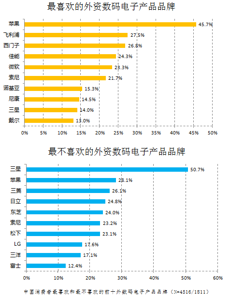 2017年的調(diào)查顯示,蘋(píng)果(Apple)是受訪者最愛(ài)的外資數(shù)碼電子產(chǎn)品品牌,提及率為45.7%;其他外資數(shù)碼電子品牌的受歡迎度與蘋(píng)果相比只能相形見(jiàn)絀。具體而言,飛利浦以27.5%的提及率排名第二位,排名第三位的是西門(mén)子(26.8%)。佳能與微軟排位第四五位,提及率分別為24.3%和23.3%。